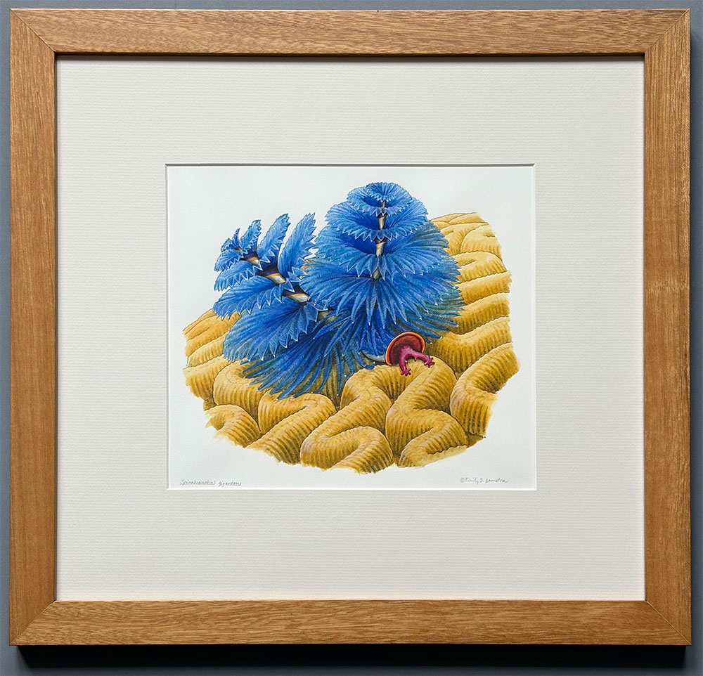 Beautiful, multi-colored Christmas tree worms live in Caribbean tropical reefs. They are commonly found embedded in stony corals, such as this brain coral. Sometime after I painted this, I remember being excited to see quite a few of these worms while snorkeling in the Caribbean. Like many marine invertebrates, their unfamiliarity (to me) makes them seem strange and otherworldly. I created this illustration for an article in Sport Diver magazine.