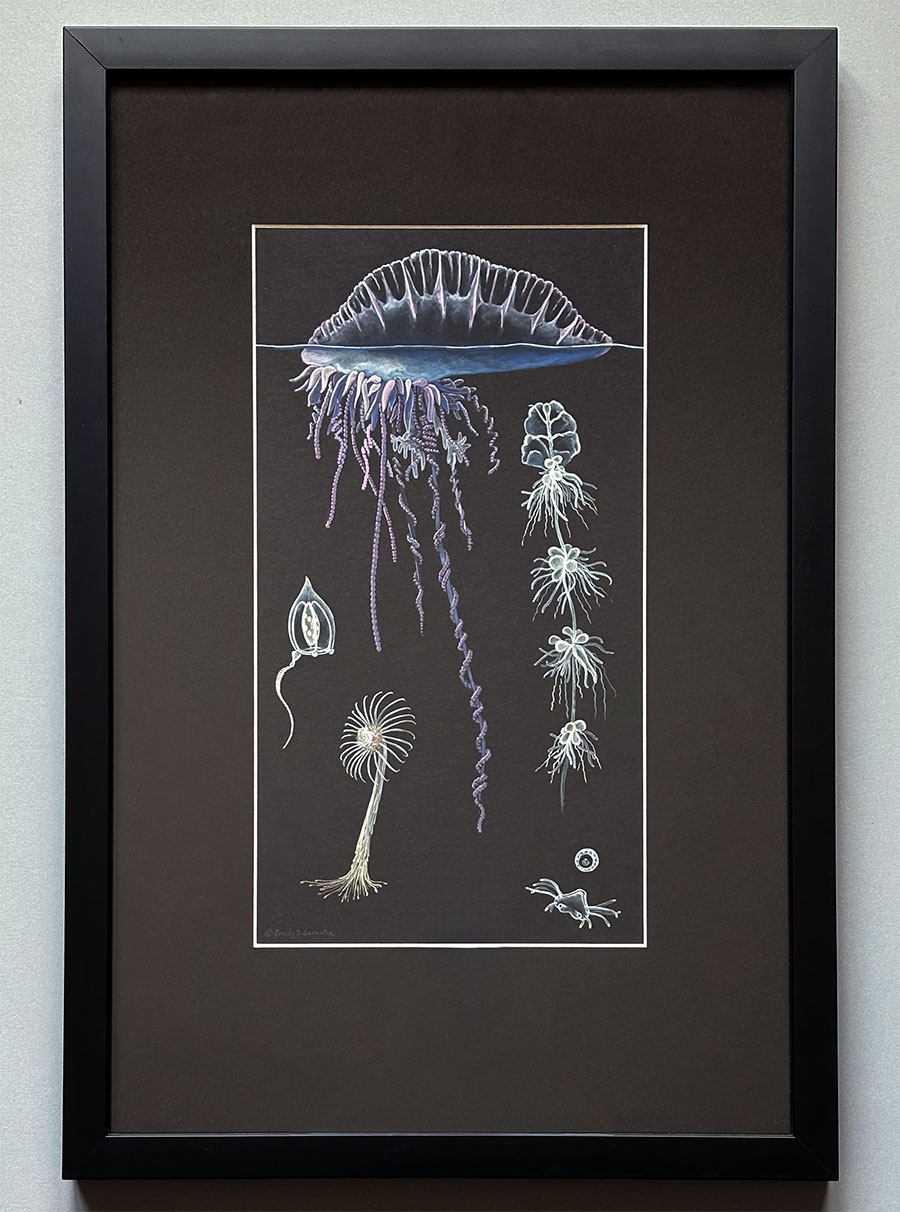 This Hydrozoans original artwork is archivally matted and framed with regular plexiglass in a black wood frame.