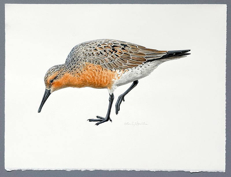 These shorebirds occur throughout much of the world, and have remarkably long migrations. I think their summer plumage is quite lovely. I painted this red knot, shown as if hunting for food in the sand, for an interpretive sign at the Smithsonian National Zoological Park in Washington, D.C.